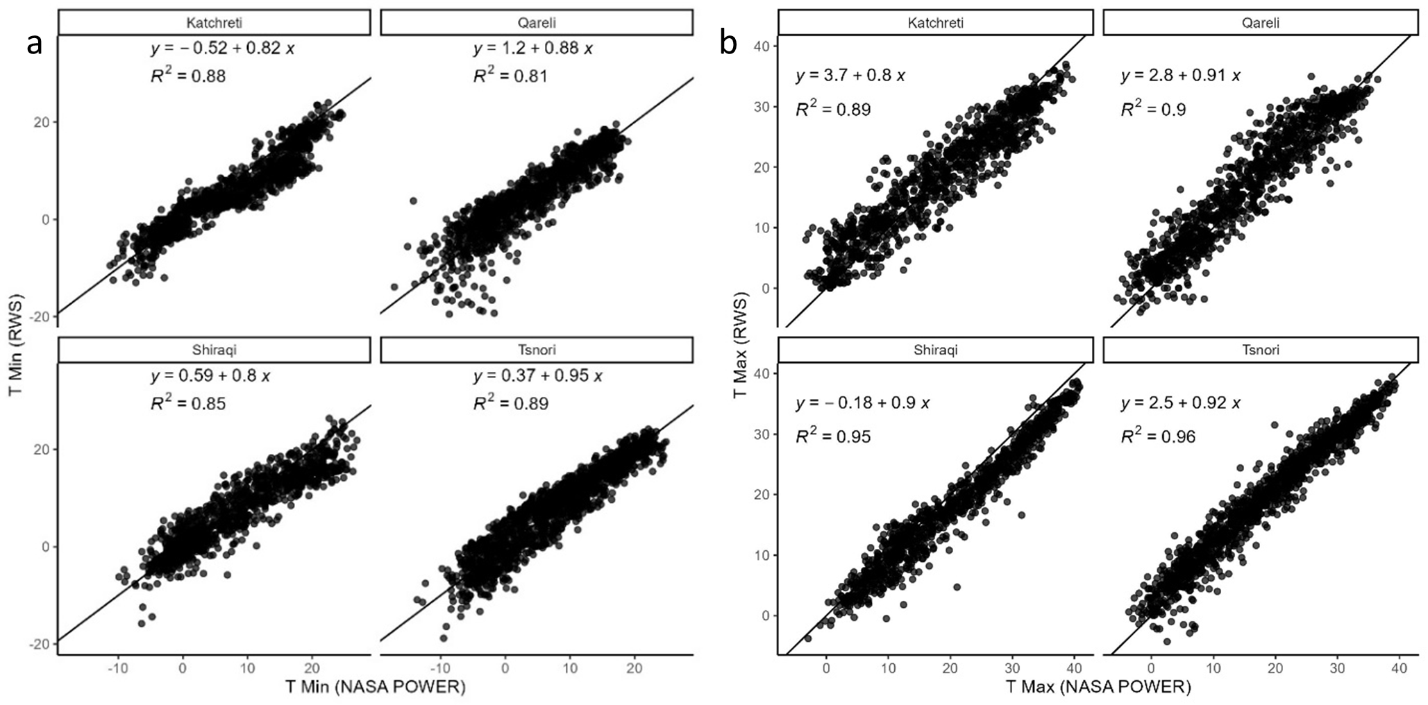 Figure 1. Validation and propagation of (a) minimum temperature and (b) maximum temperature for Katchreti (1983-1985), Qareli (1986-1988), Shiraqi (1998-2001), and Tsnori (1989-1992). Solid line represents 1:1 relationship.