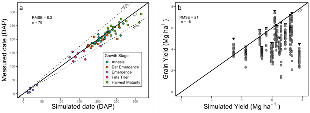 Figure 2. Model validation for (a) phenology (i.e. days after planting (DAP) for emergence, first tiller, ear emergence, anthesis, and harvest maturity) and (b) grain yield from 18 site-year combinations. Solid lines represent 1:1 relationship. For panel a, dotted lines show ±15% deviation from 1:1 line. For panel b, each point represents a site-year-variety combination and the highest observed grain yield at each site-year is shown with black triangles. Normalized root mean square error (RMSE) is also shown.