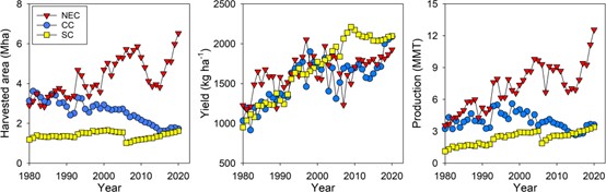 Fig. 1. Harvested area (a), yield (b) and production (c) of soybean in different regions in China. Major soybean planting regions are divided into Northeast China (NEC), Central China (CC), and South China (SC) according to the agronomic climate zonation based on a previous study (Lv et al., 1981).
